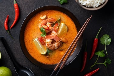 Scharfe Suppe mit Garnelen und aromatischen Gewürzen.