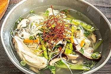 Aromatische Nudelsuppe mit zartem Hähnchen.